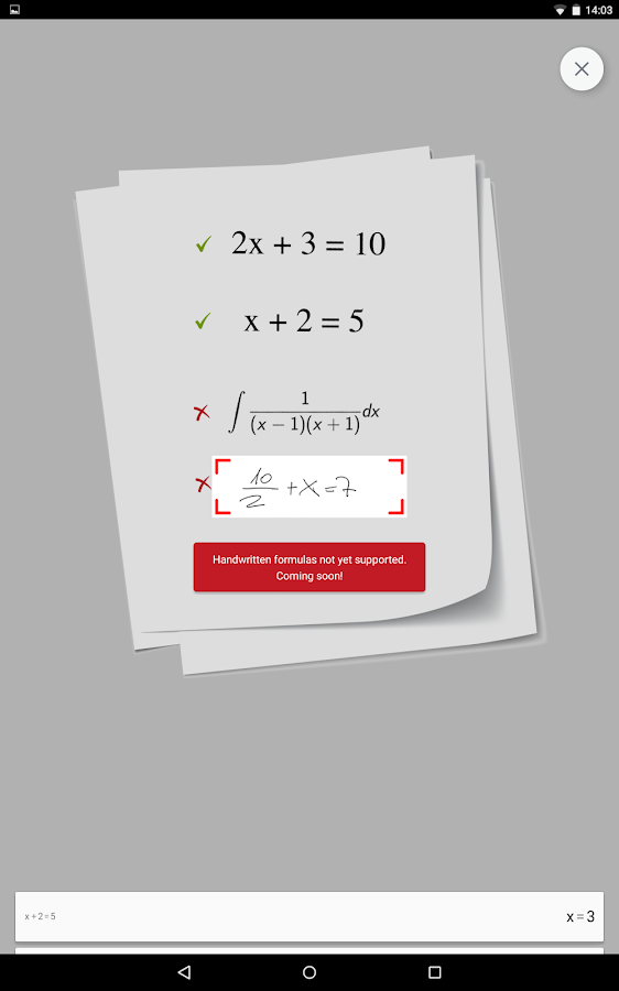 PhotoMath tidak sepenuhnya ajaib (belum) dan mungkin untuk menemukan masalah Math app kami tidak akan mengenali. Jika ini terjadi, silakan kirim umpan balik. Dengan bantuan Anda, tim kami penyihir akan menambah mantra baru untuk PhotoMath dan membuatnya lebih ajaib dalam versi masa depan. :)